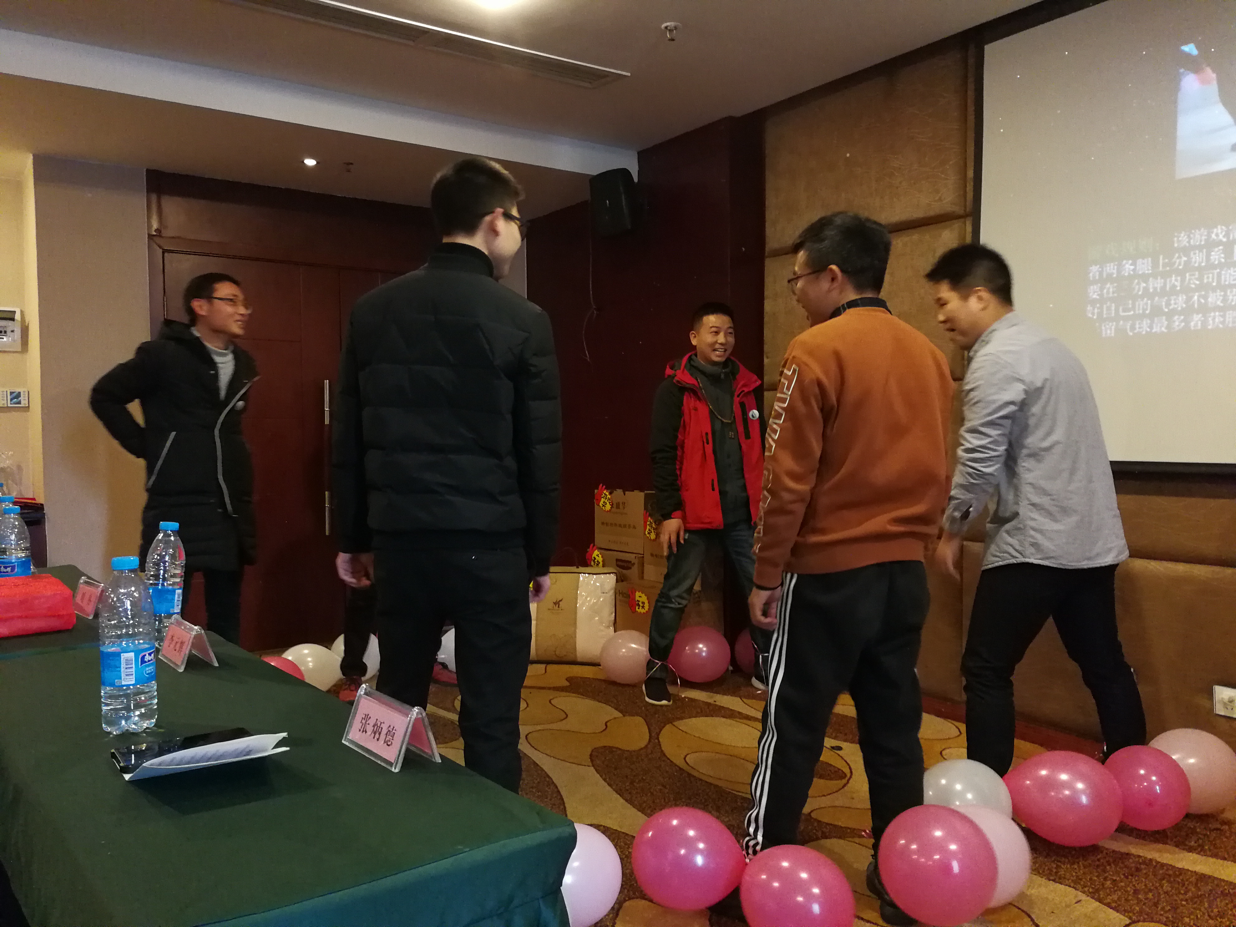 活动整个过程中还穿插了抽奖环节和游戏环节。会上共抽出三等奖3名、二等奖2名、一等奖1名。其中一等奖获得者是公司合作伙伴张开勇。游戏环节中的踩气球比赛将整个团拜会推向高潮,该游戏6个人参加,游戏进行一半演变成总公司经营部与工程部部门之间的对决,最终经营部赵航获得第一名。