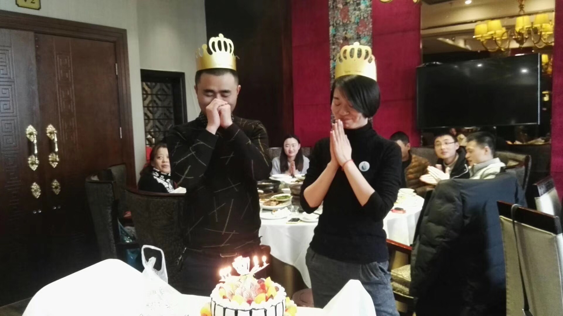 午餐于12点30分开始,当月公司有两名员工(王威、刘晓玲)生日,公司在午宴上为他们送上生日蛋糕,全体成员为他们唱响生日歌。他们也在大家的祝愿下许下生日愿望,并为大家派发生日蛋糕。整个会场一片其乐融融的景象。